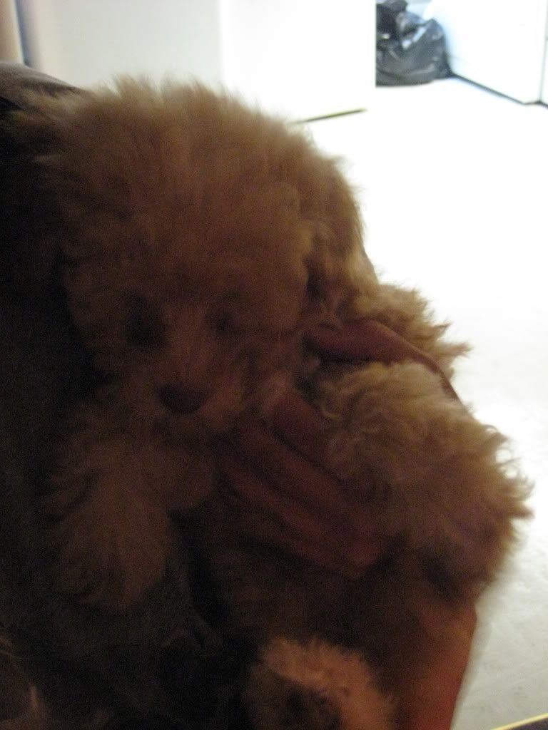 Well definitely a surprise, Out of nowhere we got a Puppy. Total of three dogs now lol. She's a little toy poodle, Name's Sandy. She is incredibly cute been playing with her for like an hour.